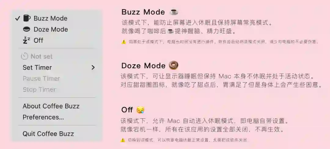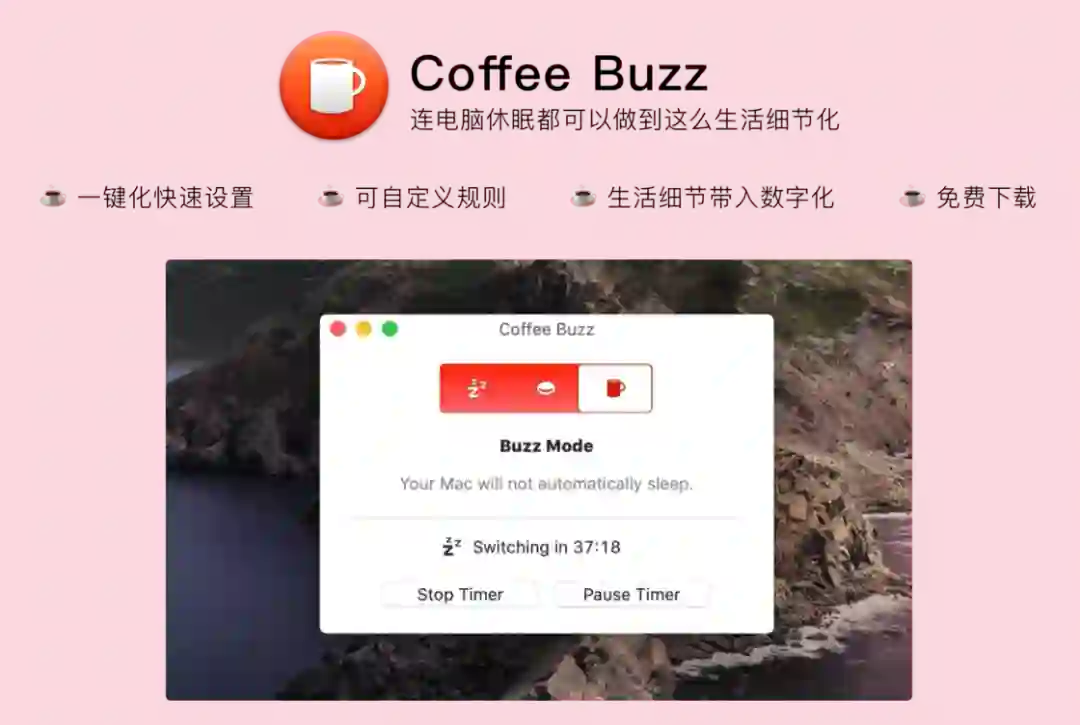Coffee Buzz 是一款 macOS 平台对 Mac 休眠进行多模式设置的软件,通过 Coffee Buzz 能够快速一键化设置电脑「需要怎样」进入休眠状态。或许听起来很绕口,但结合图标看看就清晰了然了。