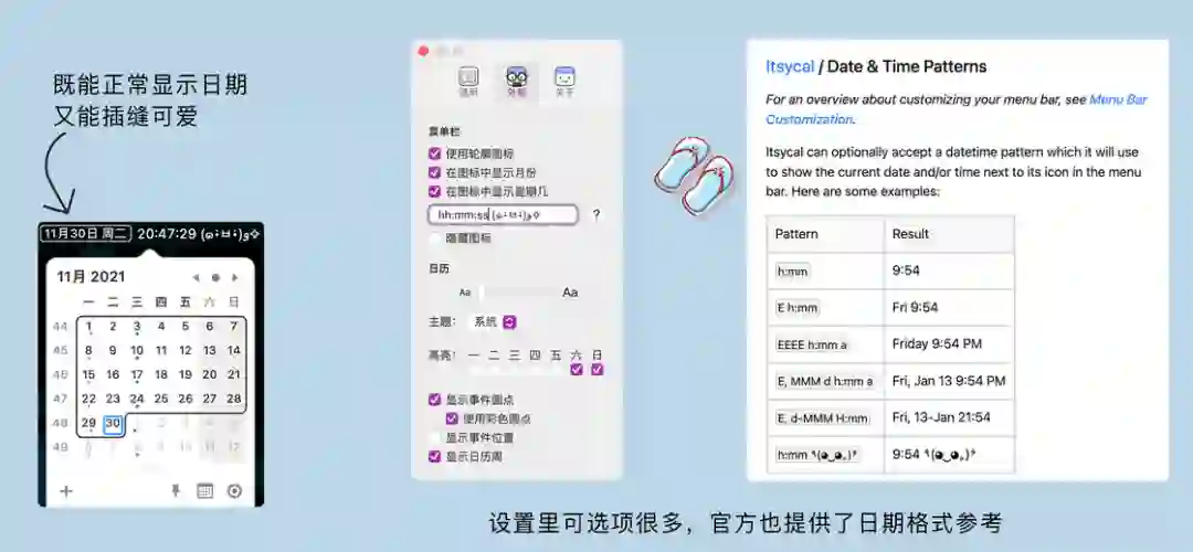 Itsycal 在菜单栏的日期显示上支持自定义格式,即可以选择年/月/日/时/分/秒的具体呈现格式,官网介绍中也给出了详细的