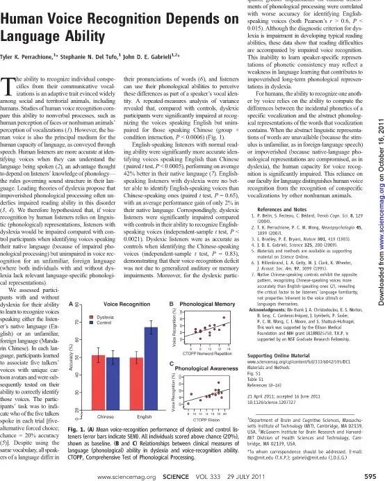 刊登在Science上的这篇文章,题目为《Human Voice Recognition Depends on Language Ability》(2011年7月29日),作者是美国麻省理工学院(MIT)的三位研究人员。