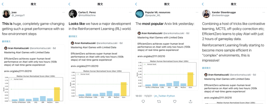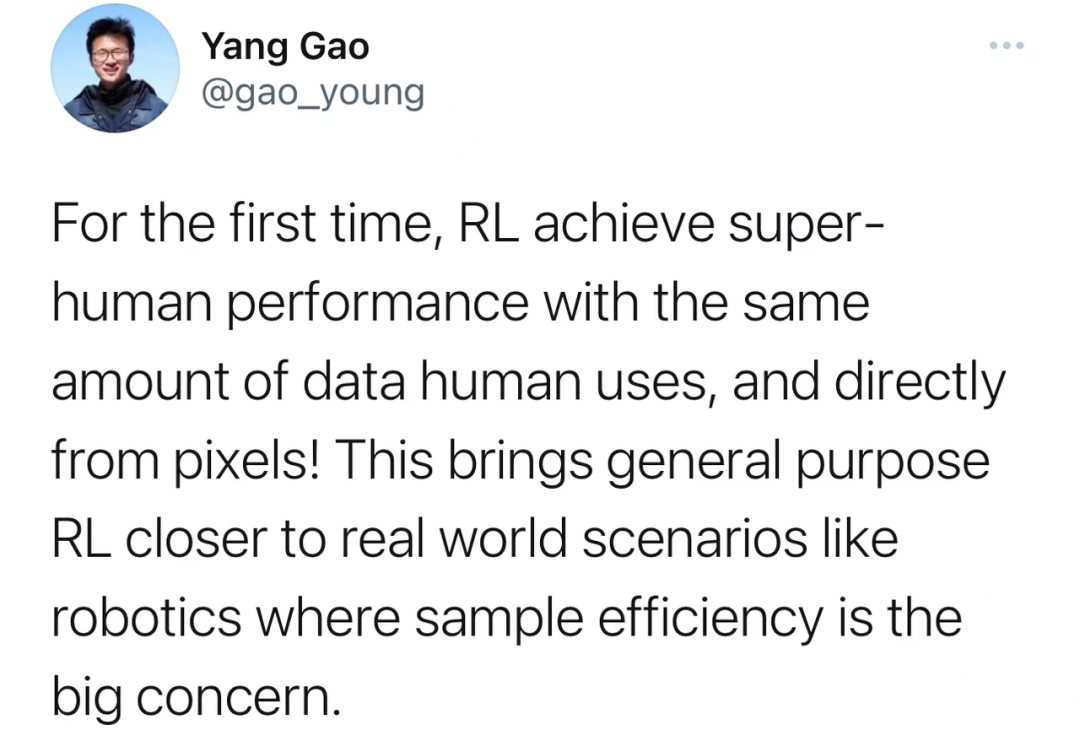 近日,一项研究在学术界引起了广泛的关注和热议。有消息称,Deep Mind和Google已经在内部关门开会讨论了。粉丝众多的科技向youtube博主Yannic kicher甚至专门做了半个小时的视频来讲解这篇论文。学者们更是用“completely game- changing”、“major development in RL”、“this is impressive”来形它。其团队老师本人也在推特上表示:在使用相同数据的情况下,这是RL智能体第一次直接从像素中获得了超越人类的性能!这会让通用强化学习更接近真实世界的场景,比如机器人的采样效率会是关注重点。