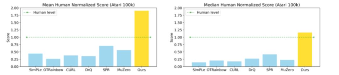 如图所示,EfficientZero在人类平均标准得分中位数上分别比之前的SoTA性能出色170%和180%。是第一个在Atari 100k基准上优于人类平均性能的算法。