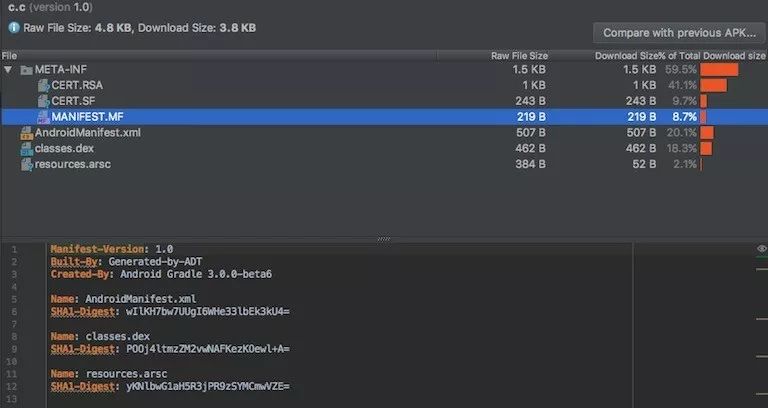 很奇怪!我们对未对齐的 APK 解压缩并手工签名,并手动移除了META-INF/MANIFEST.MF,这削减了 543 字节。如果有人知道原因,请告诉我!