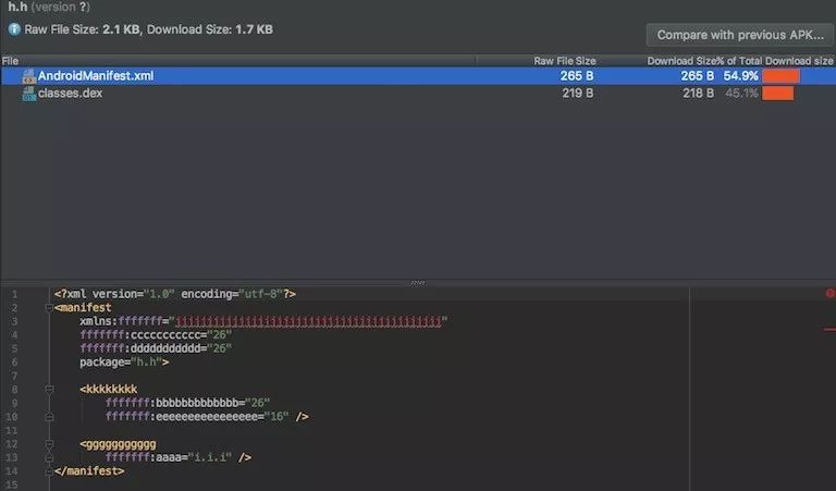 看上去AndroidManifest文件非常类似于我们的原始输入文件。唯一差别在于,文件中的字符串和 Drawable 等资源被整数资源 ID 所替代,这些 ID 以0x7F开头。