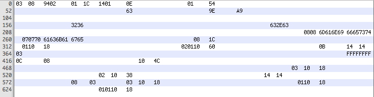 以十六进制查看文件可显示文件头部的值,这些值描述了字符串池及其它值,例如0x9402是文件的大小。字符串也具有一种有意思的编码。如果字段超出了 8 个字节,它们的总长度将在随后的两个字节中指定。