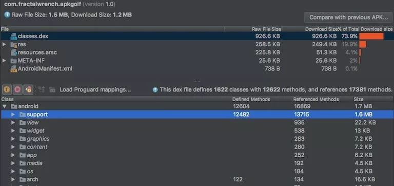 现在classes.dex文件已削减到占用 APK 的 57%。在我们的 Dex 文件中,大多数方法引用属于android.support软件包,因此我们将要去除该支持库。具体做法为: