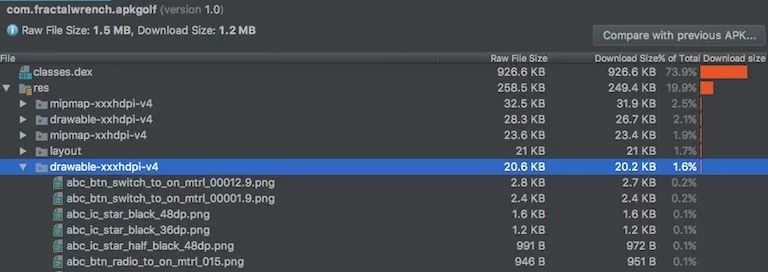 目录“res”现在占用 APK 规模约 95%,原因是所有的加载图标。如果这些 PNG 图片是由我们自己的设计师所给出的,那么我们可以尝试 将它们转换为 WebP 格式,该格式更加高效,并被 API 15 及以上所支持。
