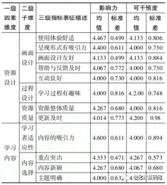 可以看出,对学习投入影响大且可干预程度高的因素主要包括资源设计和学习内容两个一级维度。资源设计包括资源质量、画面设计和过程设计三个不同的二级子维度,其中画面设计因素的具体表征指标最多,且综合评定得分较高。因此,移动学习资源画面设计因素是提高移动学习投入最为优先考虑的关键因素。
