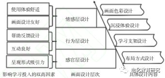 大量实验和设计实践证明,运用多媒体画面语言学的系统化设计思想进行资源画面设计,是非常科学、有效的。表2中,从多媒体画面语言的视角看,画面设计的五个因素属于多媒体画面语言学的语构层,并辐射影响画面语义层和画面语用层[5],是移动学习资源画面设计研究的核心范畴。伯恩德·H·施密特提出“感觉—情感—思考—行动—关联”的用户体验五环节,构筑用户的全面体验;侧重用户体验过程及与之伴随的情感与认知变化,用户在体验过程中伴随着认知与思考等高级思维加工过程而产生体验的跃迁[6]。用户体验设计师诺曼将设计分为本能层、行为层和反思层三个层次[7]。依据上述用户体验的设计思想,将影响学习投入的5个画面设计双高因素进行层次归类,结果见表3。