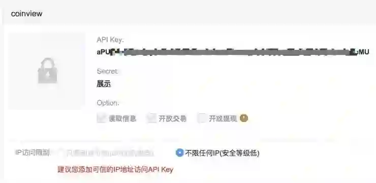 从币安 API Key 的权限默认设置中也可以看出些细节。首先,在默认权限设置中并不限制任何 IP 的访问,但也提醒了用户安全等级较低的问题。另外,币安并未将开放提现设置为默认选项,但有些用户为了操作方便既没有限制IP,甚至打开了取款提现选项。