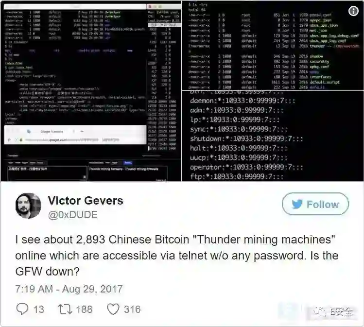 E安全9月1日讯 荷兰安全研究人员维克托·赫韦尔已经在互联网上发现2893台比特币挖矿设备,且其Telnet端口并无任何密码保护措施。