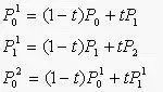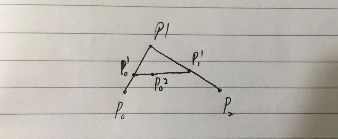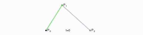 下图是一根二次贝塞尔曲线的绘制过程。因为轨迹已知,所以在各个阶段的起始点都是可以通过getPointAtLength方法获得的。唯一需要计算的只有不同阶段贝塞尔曲线控制点的位置。可以看到绘制它的过程中需要持续更新控制点,为此我去查了下二次贝塞尔曲线控制点的计算公式。