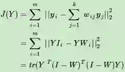 如果令M=(I−W)^T(I−W),则优化函数转变为最小化下式:J(Y)=tr(Y^TMY),tr为迹函数。约束函数矩阵化为: