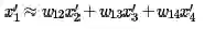 其中w12,w13,w14为权重系数。在通过LLE降维后,希望x1在低维空间对应的投影x1′,同时x2,x3,x4对应的投影x2′,x3′,x4′也尽量保持同样的线性关系,即