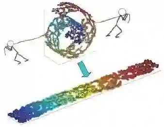 一个形象的流形降维过程如下图。有一块卷起来的布,希望将其展开到一个二维平面,同时也希望展开后的布能够在局部保持布结构的特征,其实也就是将其展开的过程,就想两个人将其拉开一样。