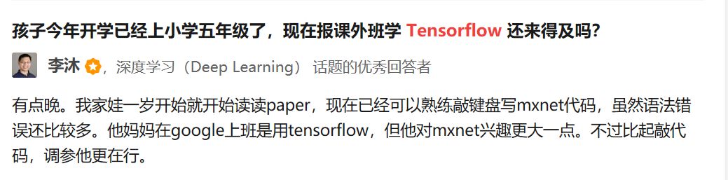 知乎的网友都认为这是“一不小心”的晒娃狂魔,其实李沐还是一个炫妻狂魔:“他妈妈在Google上班是用 Tensorflow”