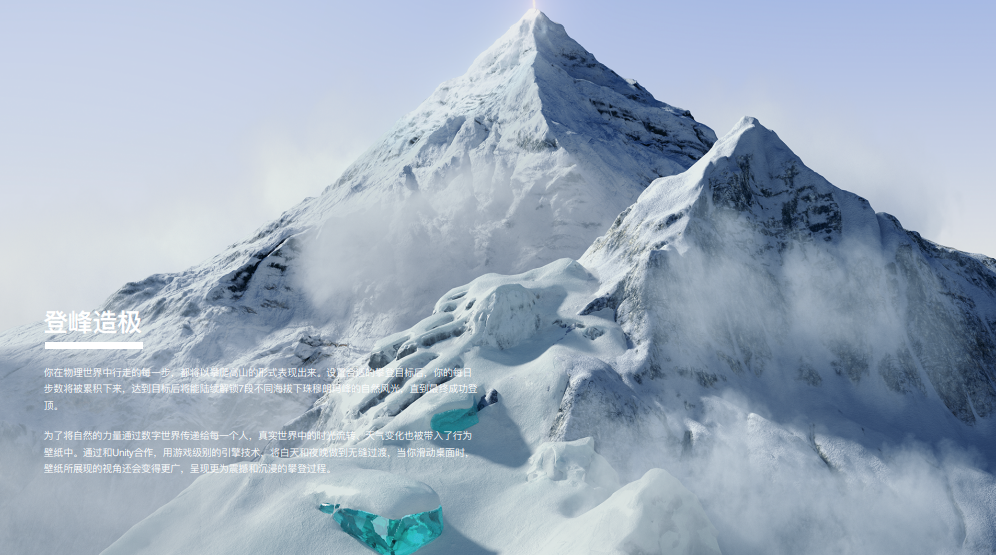 ⾏为壁纸创造性地将物理世界的步数与数字世界进⾏关联,在这⾥,用户可以通过不断的⾏⾛收获令⼈愉悦的视觉体验,逐渐形成正向、积极的⽣活态度。
