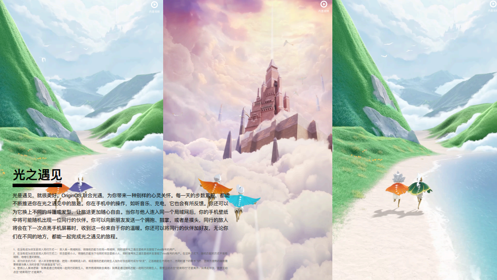 OriginOS 联合《光遇》,为用户带来⼀种别样的⼼灵关怀,例如每⼀天的步数累积,都能不断推进用户在光之遇⻅中的旅途。用户在⼿机中的操作,如听⾳乐、充电,它也会有所反馈。用户还可以为它换上不同的⽃篷或发型,让旅途更加随⼼⾃由。当用户与他⼈连⼊同⼀个局域⽹后,其⼿机壁纸中将可能随机出现⼀位同⾏的伙伴。用户可以向新朋友发送⼀个拥抱、⿎掌,或者是摸头,同⾏的旅⼈将会在下⼀次点亮⼿机屏幕时,收到这⼀份来⾃于对方的温暖。