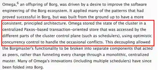 为了解决两级调度器的全局视野和并发问题,Google开发了下一代资源调度系统Omega。