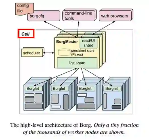 一个 Borg 集群由一个逻辑中央控制器 BorgMaster 和若干代理节点 Borglet 组成,属于集中式调度器。「Borg架构跟黑社会似的,一个老大,多个小弟」。