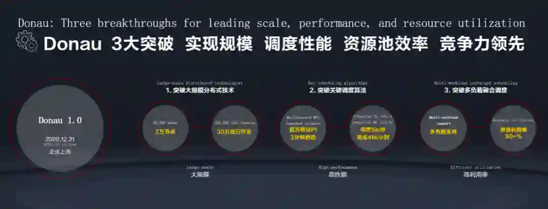 所以,统一调度器可以融合多种负载,HPC可以有适配HPC的调度策略和执行框架,AI和大数据也有自己的,但是这些策略和框架都同时存在于一个统一调度器中,能相互协同,使得大规模集群的资源利用率提升到90%。