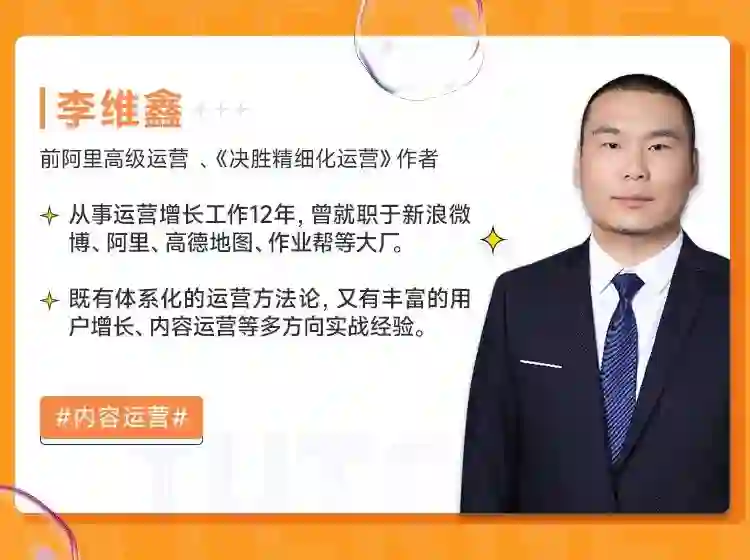 @李维鑫老师 从事运营增长工作12年,微博早期人员之一,从0-1深度参与多款产品的运营,对整个互联网内容生态有丰富的积累和深刻的理解。