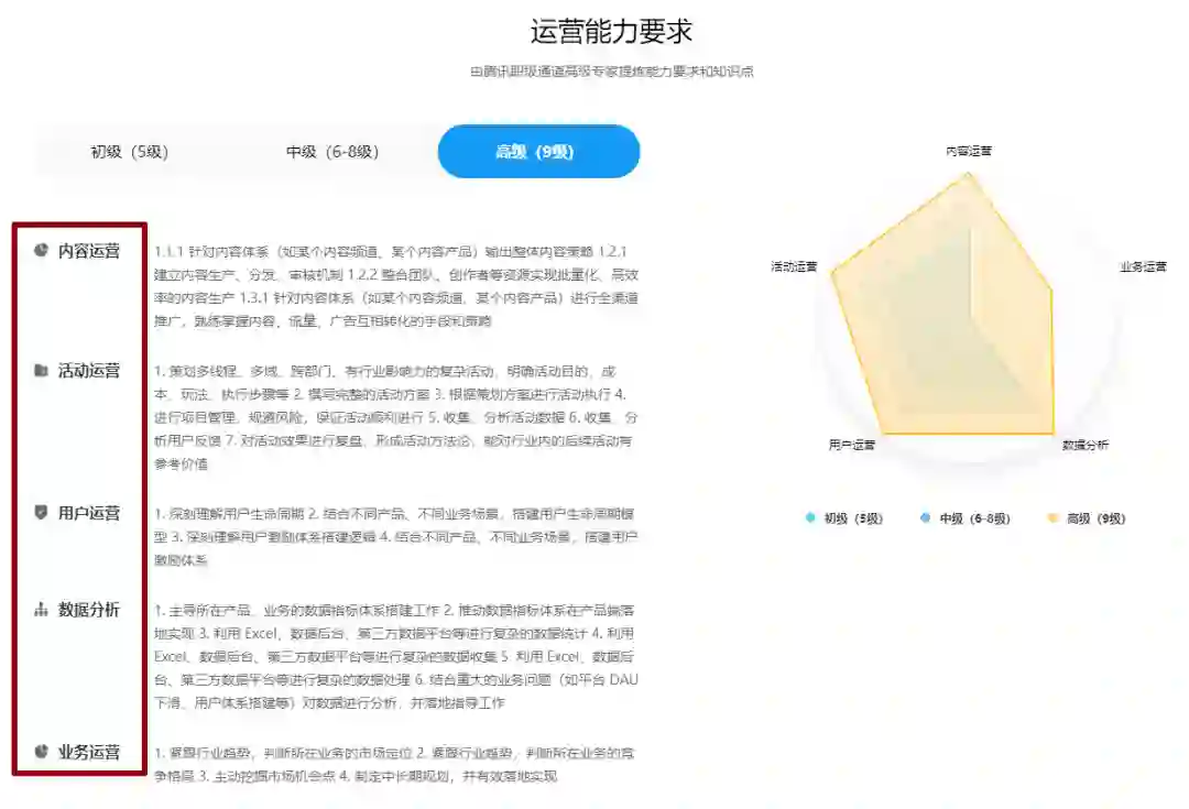 在这个模型里,可以看到:从初级到高级,大厂对于运营人内容运营、活动运营、用户运营、数据运营都有不同的能力要求。