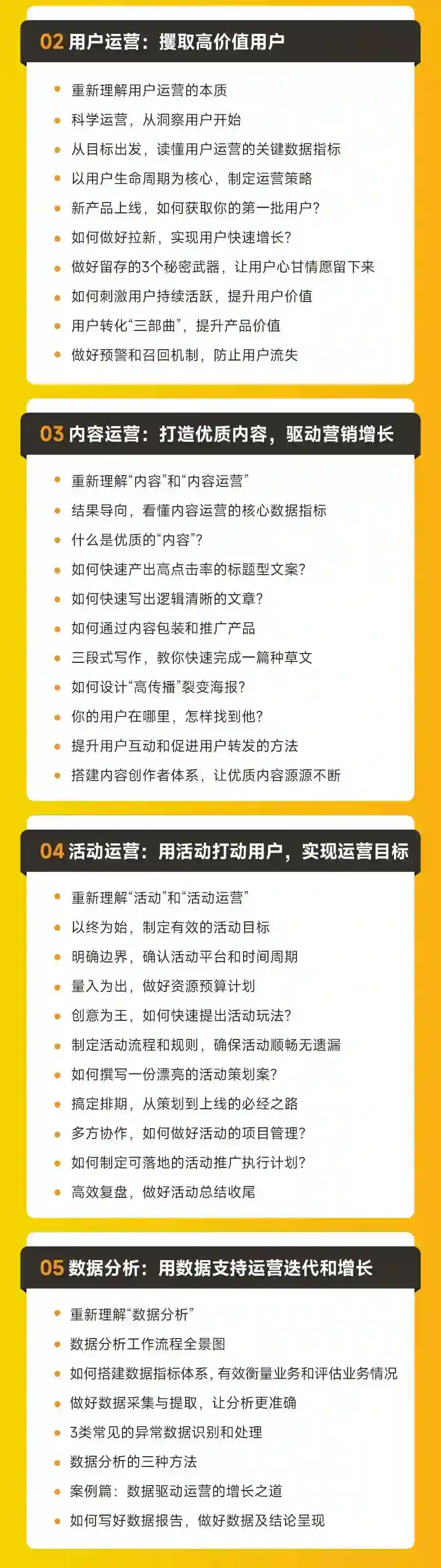 课程覆盖了全栈运营人必备的用户、内容、活动、数据运营各方面的能力。