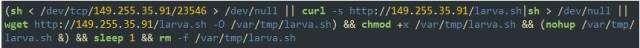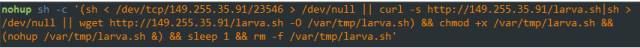 Zealot会通过几种方法来捕捉该脚本。首先,它会通过TCP 插口链接一个远程服务器,将收到的数据重新导向shell。如果失败,Zealot将使用“curl”和“wget”工具下载并执行一个名为“larva”的文件,然后立刻删掉。