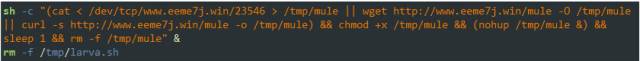 然后它会使用同样的下载和执行技巧,捕捉一个名为“mule”的文件,这是一个加密货币挖矿机的恶意软件。