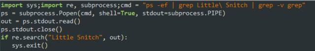 可以看到,这个python代码会检查是否“Little Snitch” 进程是否在执行(“Little Snitch”是一个针对mac OS 的防火墙设定服务 )。如果在执行,那么python代码会停止。如果未执行,那么它会向C&C服务器发送请求,捕捉另一段python代码。