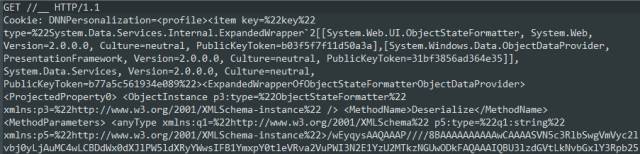 Zealot攻击者发送的另一个指令是利用DotNetNuke,一个基于ASP.NET的内容管理系统,通过一个易受攻击的DNNPersonalization cookie(CVE-2017-9822)发送一个序列化的对象。