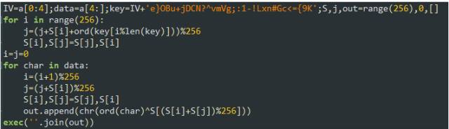 收到的内容被RC4 密码加密过,一般的网络检测设备只能看到内容,但是无法研究或者扫描。只有脚本有密钥。而此次我们收到的是另一段Python代码,可用RC4 密码解密,解密后立即执行。
