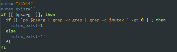 下载的bash脚本会通过测试之前定义的mutex(互斥体,21915)是否存在,来检查该机器是否已被感染。如果存在,则终止,否及将绕一圈继续执行。