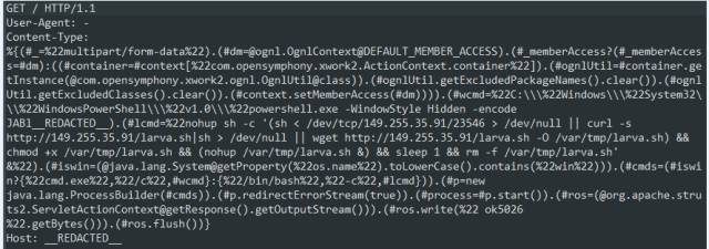 攻击始于网络扫描和两个HTTP请求。其中一个请求便是臭名昭著的 通过内容类型标头(Content-Type header)利用Apache Struts 漏洞。大多数Apache Struts 漏洞活动针对的目标要么是Windows或是Linux平台,而Zealot有载荷,目标是这两个平台。