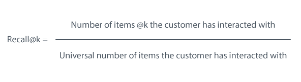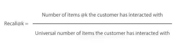 召回是客户已经与之交互的 @k 推荐项目数量,除以客户已经与之交互的项目的总数量(即使在推荐集之外)。