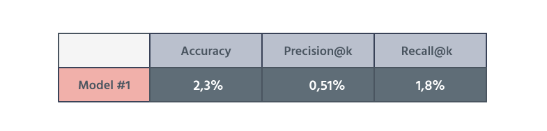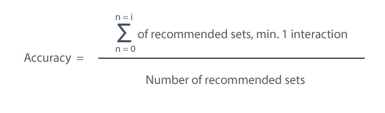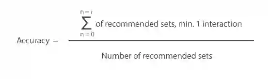 我们还使用了另一个指标:准确率分数,以测量模型的整体性能。我们把准确率分数定义为客户已经与之交互(至少一次交互/集)的推荐集总和,除以客户推荐总数。