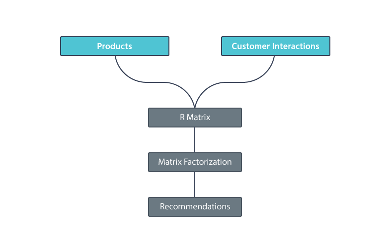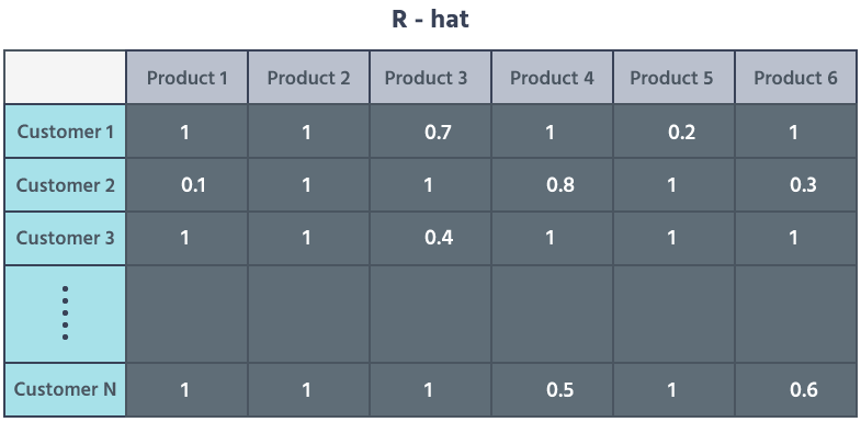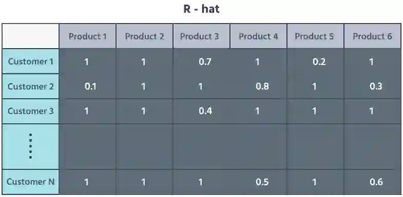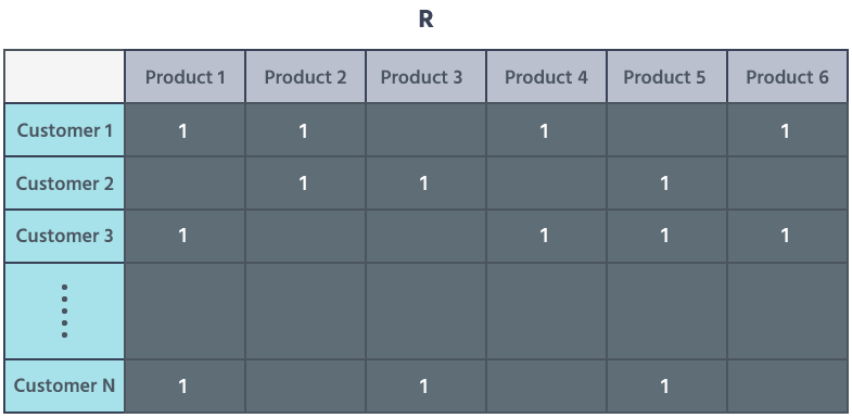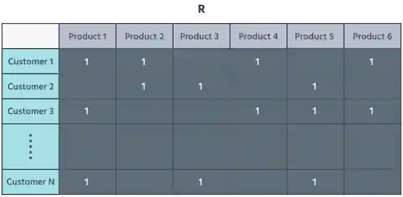 在这个案例里,我们在二维稀疏矩阵 R 中用客户的产品交互来代表他们;稀疏矩阵是一种高效计算和高效存储的方式,可以将大量数据存储在一起并准备处理。