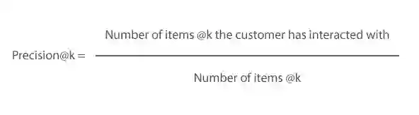 精度被定义为客户已经与之交互(浏览、添加到购物车等)的推荐项目的数量,除以推荐集 k 中的项目数量。