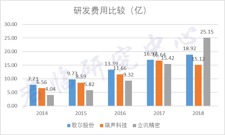 过去的几年,除了2018年被立讯精密超越,歌尔股份的研发费用在三者中都是最高。
