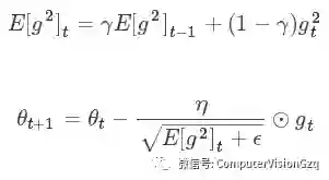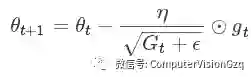 其中,Gt∈Rd×d是一个对角矩阵,其中第i行的对角元素eii为过去到当前第i个参数θi的梯度的平方和,epsilon是一个平滑参数,为了使得分母不为0(通常ϵ=1e−8),另外如果分母不开根号,算法性能会很糟糕。