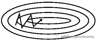 随机梯度下降最大的缺点在于每次更新可能并不会按照正确的方向进行,因此可以带来优化波动,如下图: