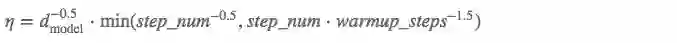 虽然通常看到一个模型的超参数要经过大规模的超参数优化,但有趣的是将学习速率退火方案看作是对细节同样重视的焦点:作者在Adam中使用参数β1= 0.9,非默认β2= 0.98,ε= 10^-9,学习率η可能是最复杂的退火方案之一: