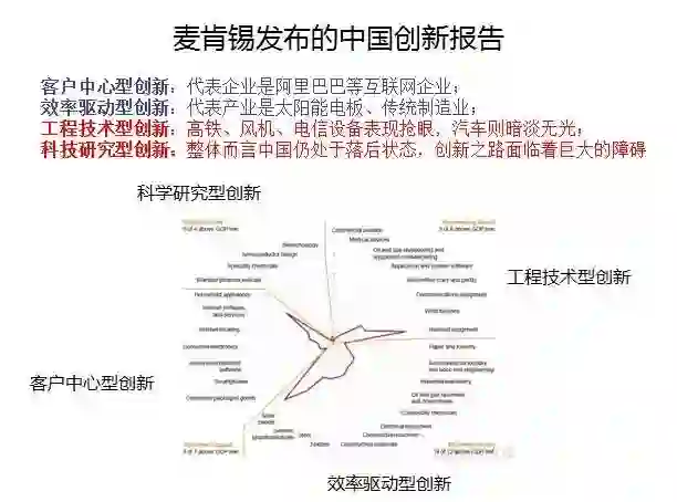 第一种是客户中心型创新,代表企业是小米、阿里巴巴等互联网企业;第二种以效率驱动型创新,代表产业是太阳能电池板、传统制造业,代表企业是富士康等中国大量的制造企业。过去三十年,中国就是依靠客户中心型创新和效率驱动型创新,在这两方面表现得都相当不错。