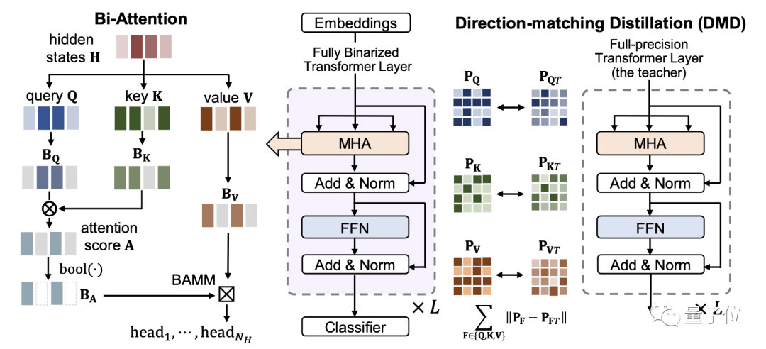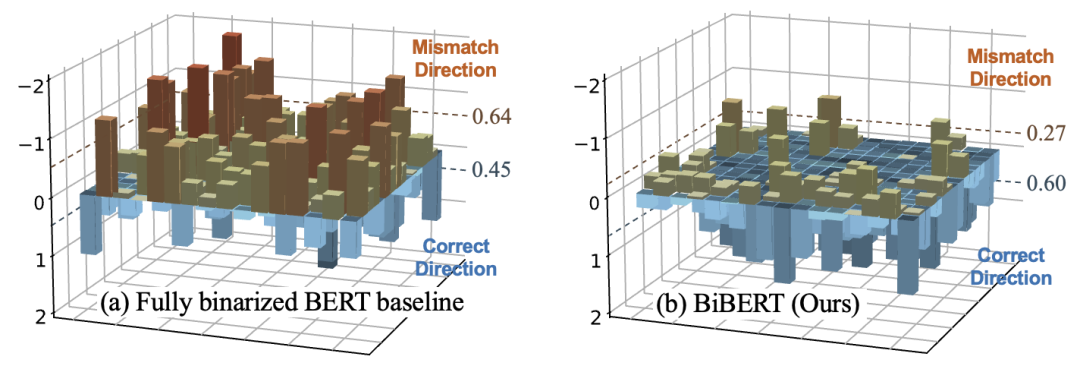 我们研究了BERT模型在二值化过程中的性能损失,作者在信息理论的基础上引入了一个高效的Bi-Attention(二值注意力)机制,解决前向传播中二值化后的注意力机制的信息退化问题;提出方向匹配蒸馏(Direction-Matching Distillation)方法,解决后向传播中蒸馏的优化方向不匹配问题。
