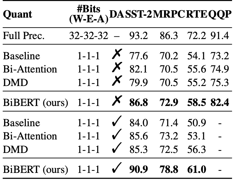 表2和表3中,作者展示了BiBERT优于其他BERT二值化方法,甚至优于更高比特的量化方案: