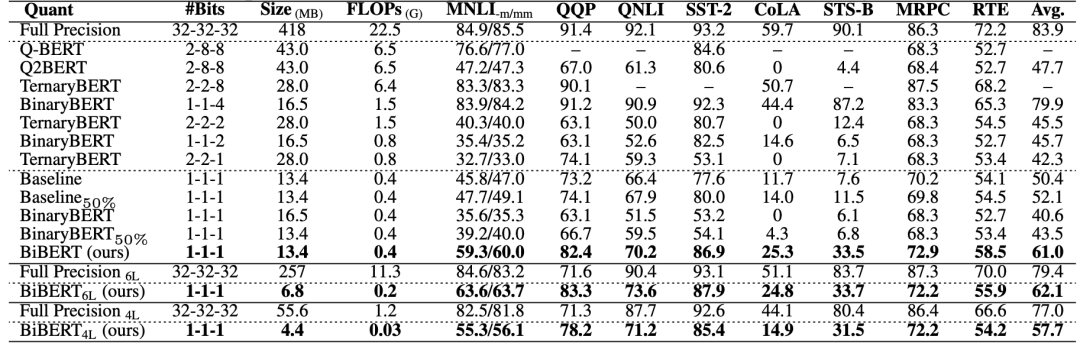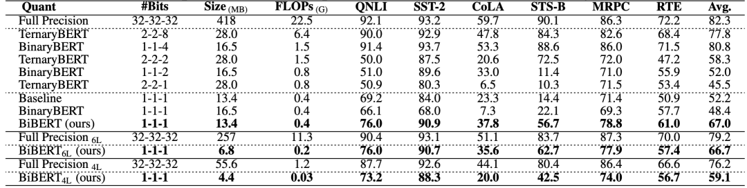 BiBERT首次证明了BERT模型全二值化的可行性,在GLUE数据集上的准确性极大地超越了现有的BERT模型二值化算法,甚至超过了更高比特表示的模型。