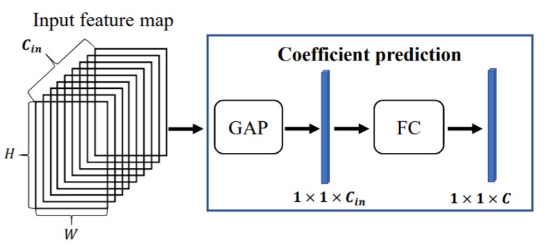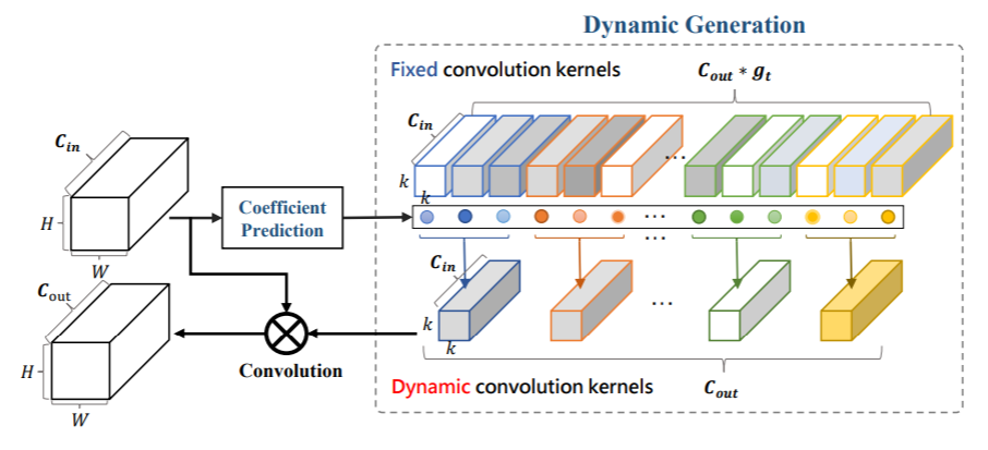 其核心思想和谷歌提出的条件卷积类似,通过activation生成一组权重,然后对fixed 权重进行加权求和生成动态卷积的权重。和CondConv主要区别在于该论文生成的权重参数更多,对于谷歌而言,一组卷积核的权重是共享的,而该论文是不共享的。