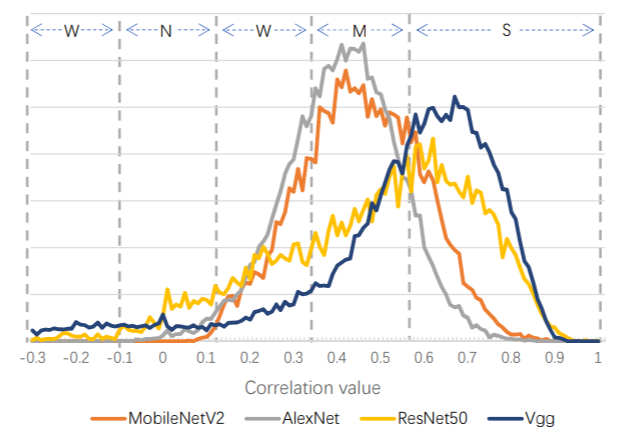 可以看到,VGG的网络输出有较强的相关性。MobileNetv2的相关性相对较小,对于裁剪算法也较难进行裁剪。