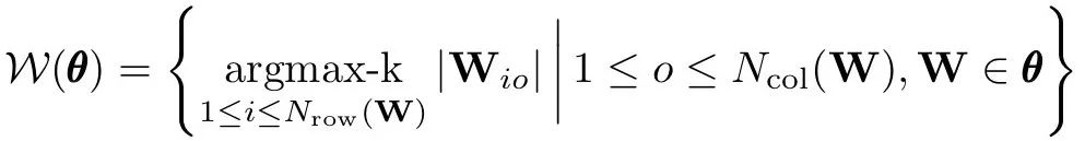 因此,希望找到最优参数θ*,它能令损失函数ε(W(θ*))尽可能小的同时,令|W(θ* )|≤k,即希望保留神经网络中最高数量级的k个权重。一个确定性的实现可以选择最小的|θ|−k个元素,并删除它们。但是如果这些较小的值在训练中变得更重要,那么它们的数值应该是增加的。因此,通过利用targeting proportion γ和删除概率α,将随机性引入到了这个过程中。