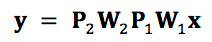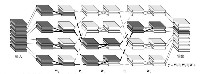 图 1:交替结构稀疏的卷积结构。(图中的实线箭头)是分块稀疏矩阵,对应于分组卷积。P_1和P_2是重排序矩阵(图中的虚线箭头)。所产生的复合卷积核